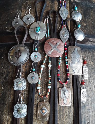 Sterling Silver hand-stamped and engraved Peyote Bird over Bronze on leather string tie.